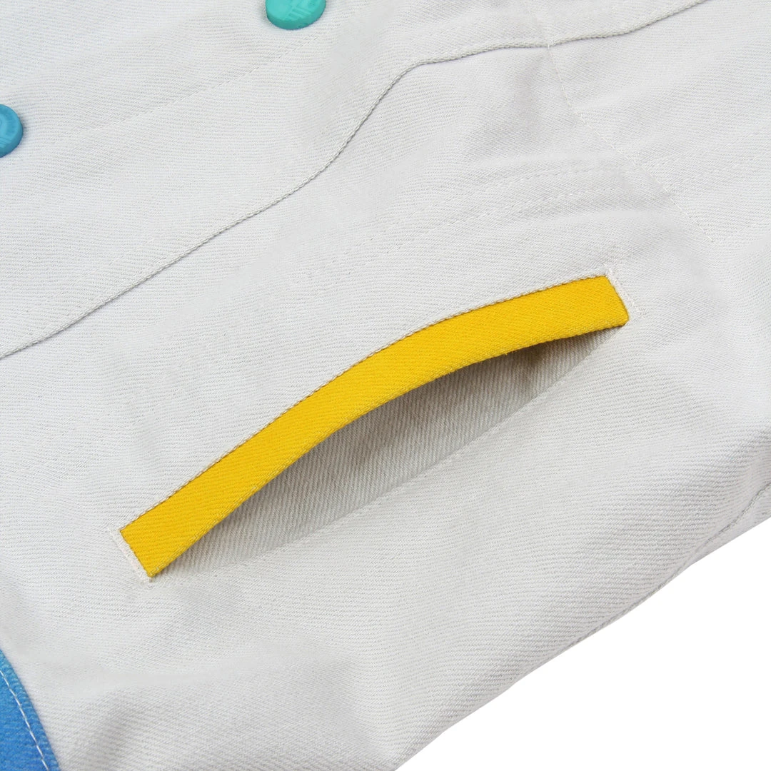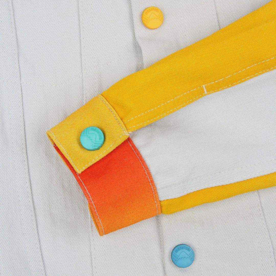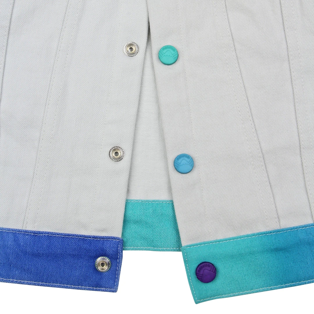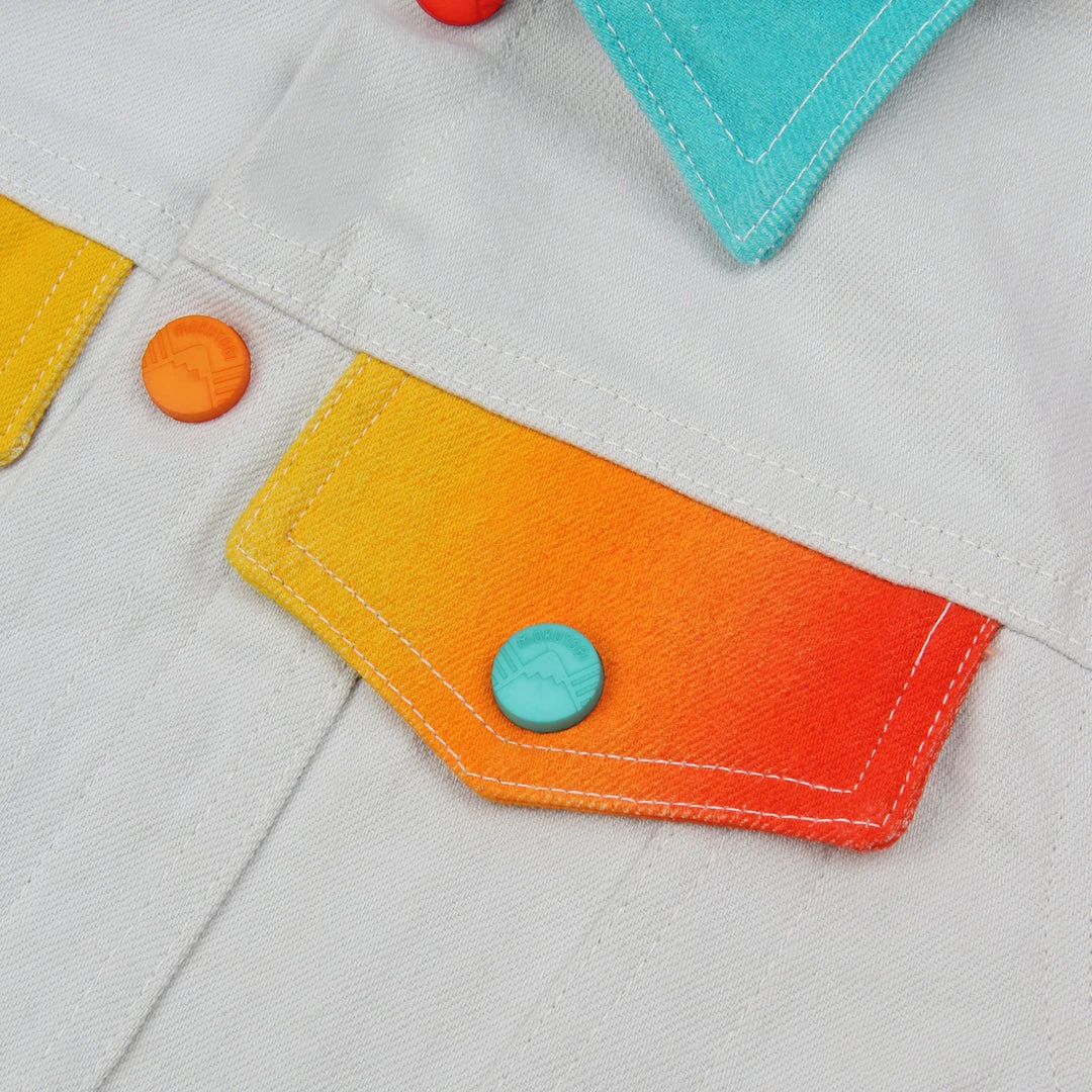Our airbrush denim jackets are back! Hand airbrushed by piece for an amazing spectrum blend effect with a solid contrast light grey dyed base. Features two front welt pockets, two chest snap flap pockets, and inside pockets with illustrated tag!