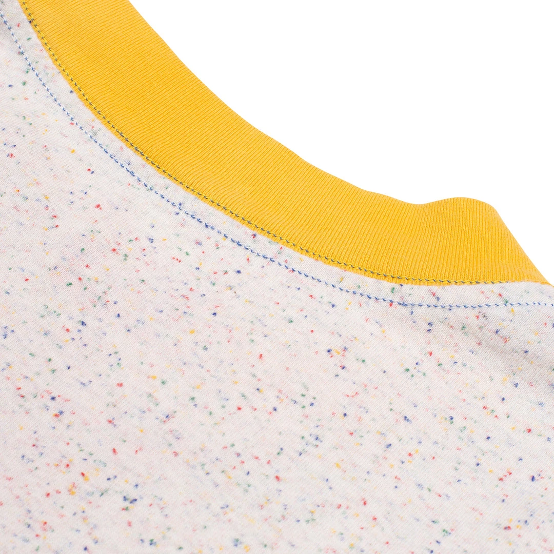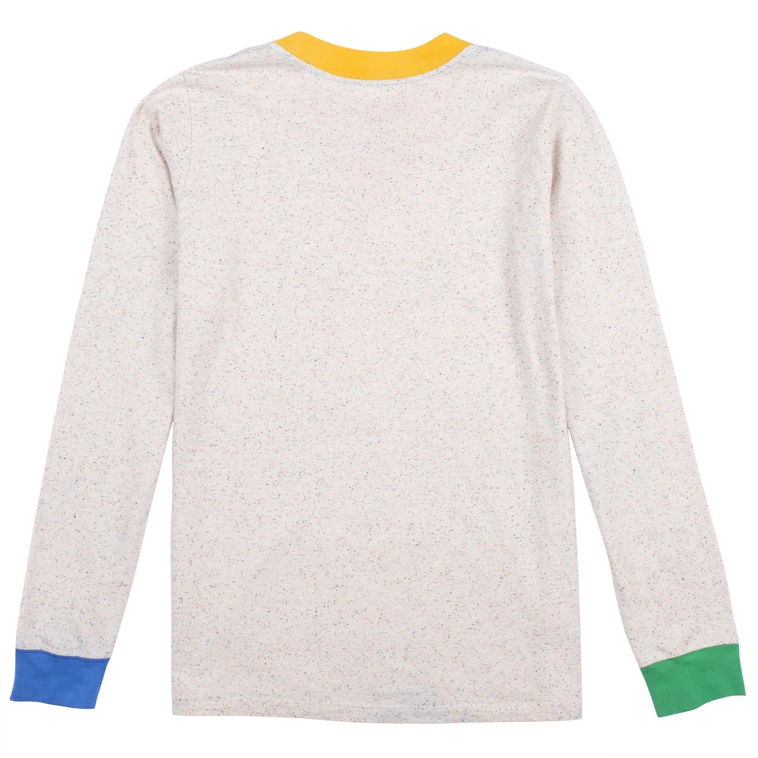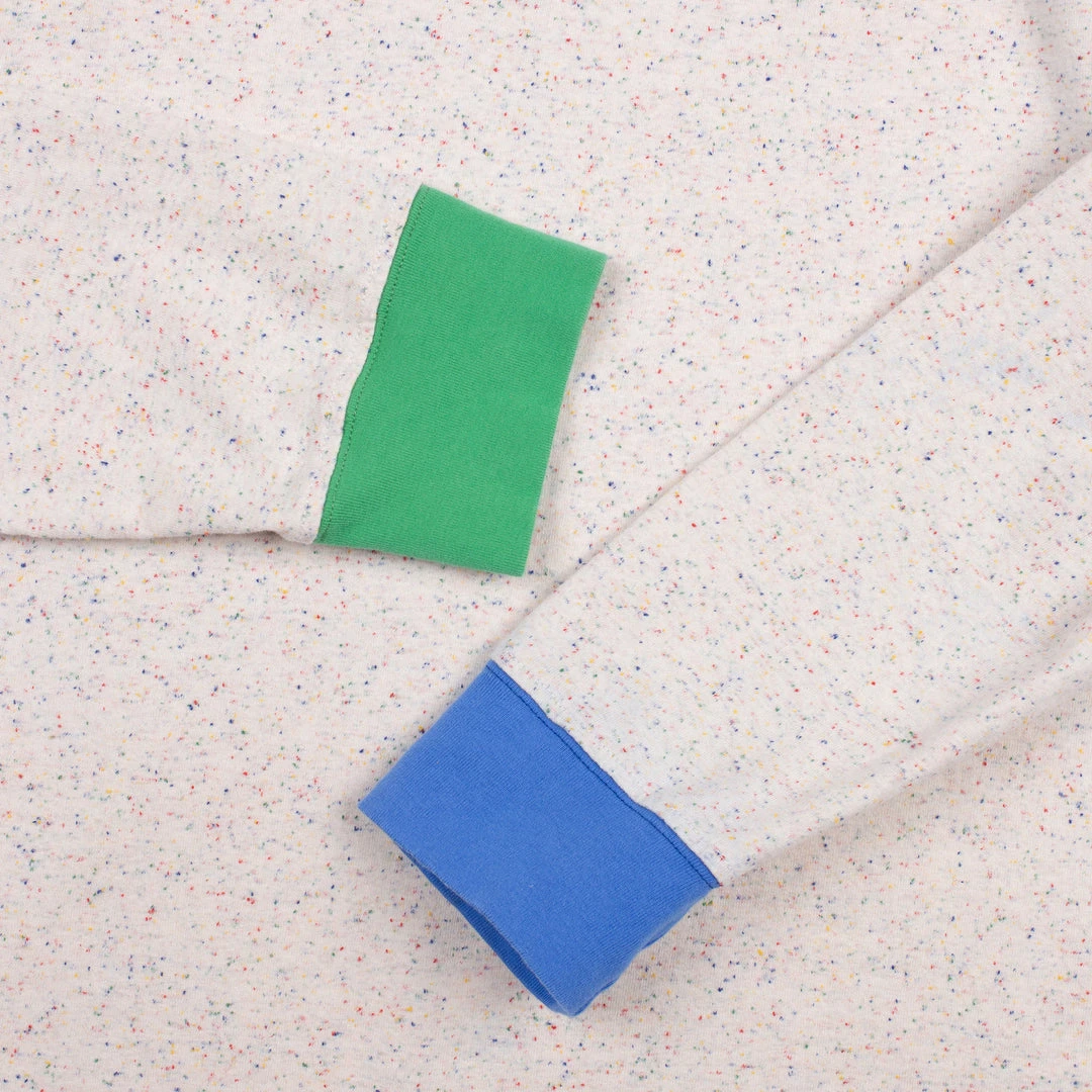 A fun basic that you’ll need to add to your rotation ASAP. Custom dyed to match rib, color block neck detail, and sleeve cuffs all paired with a fun primary speckle jersey fabric base.