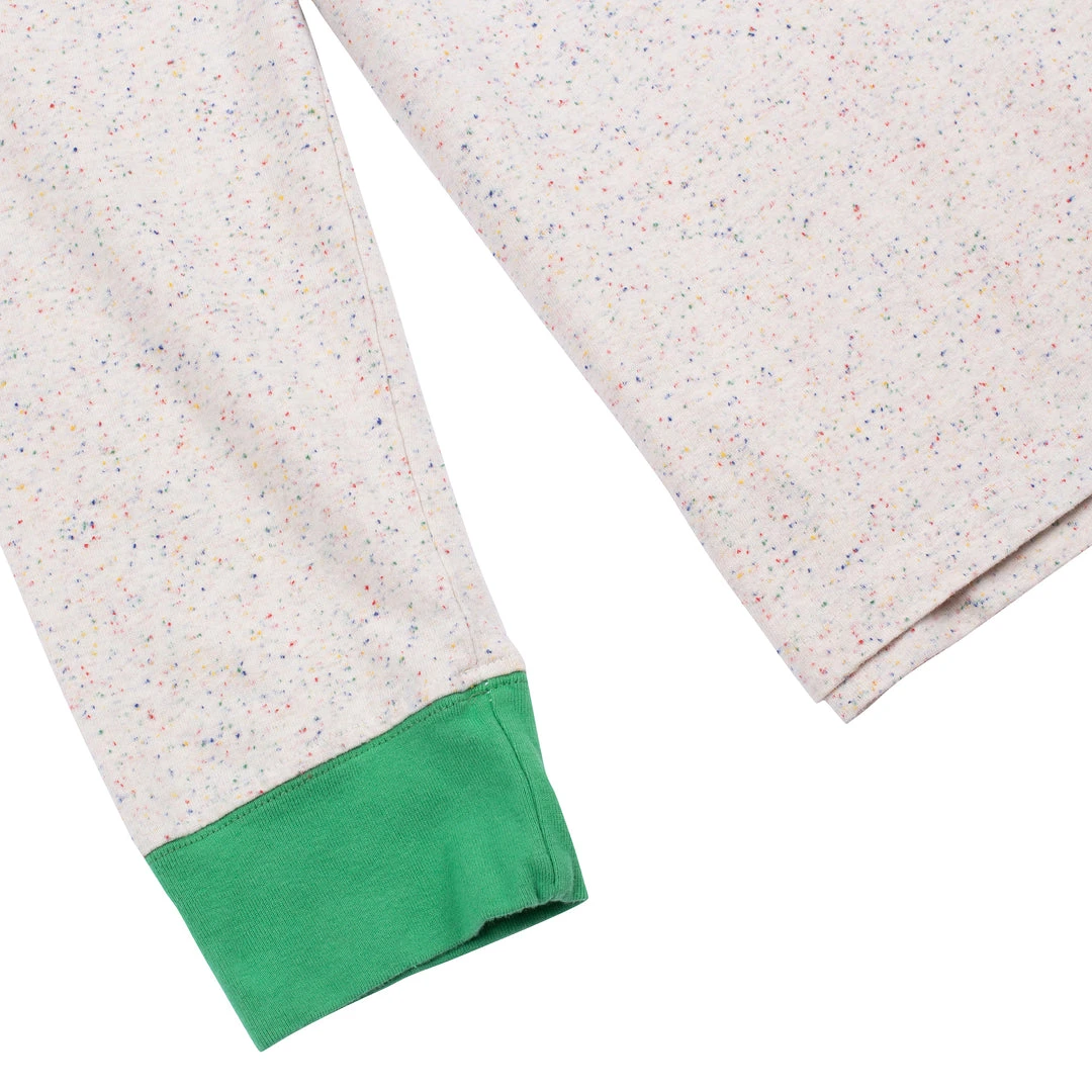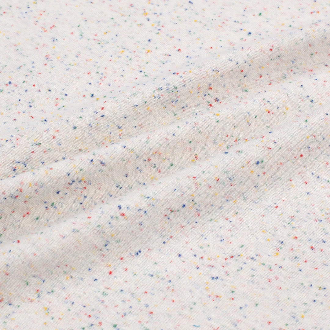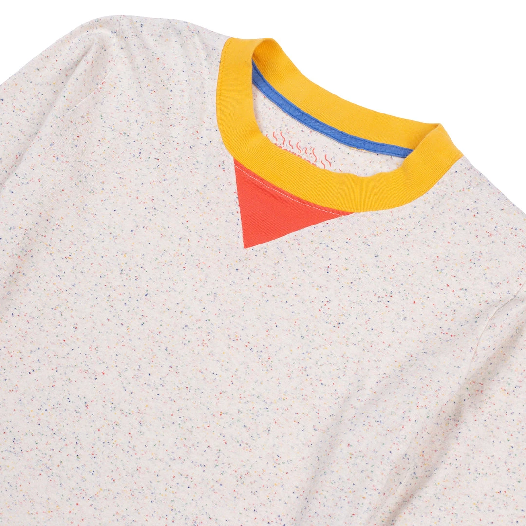 A fun basic that you’ll need to add to your rotation ASAP. Custom dyed to match rib, color block neck detail, and sleeve cuffs all paired with a fun primary speckle jersey fabric base.