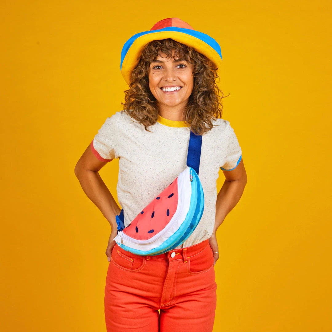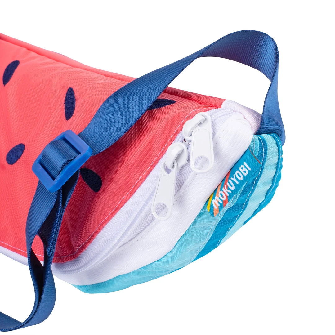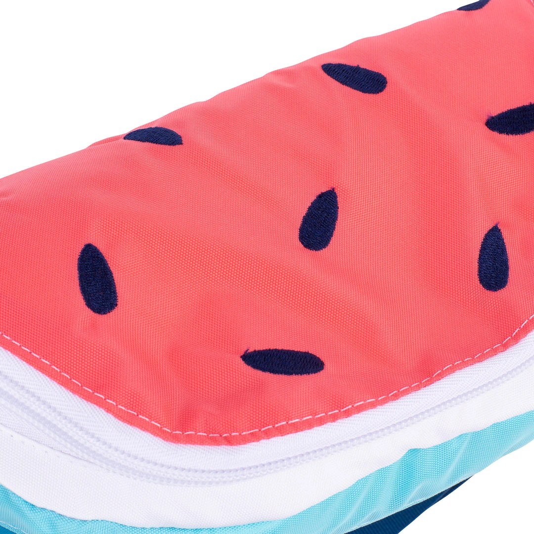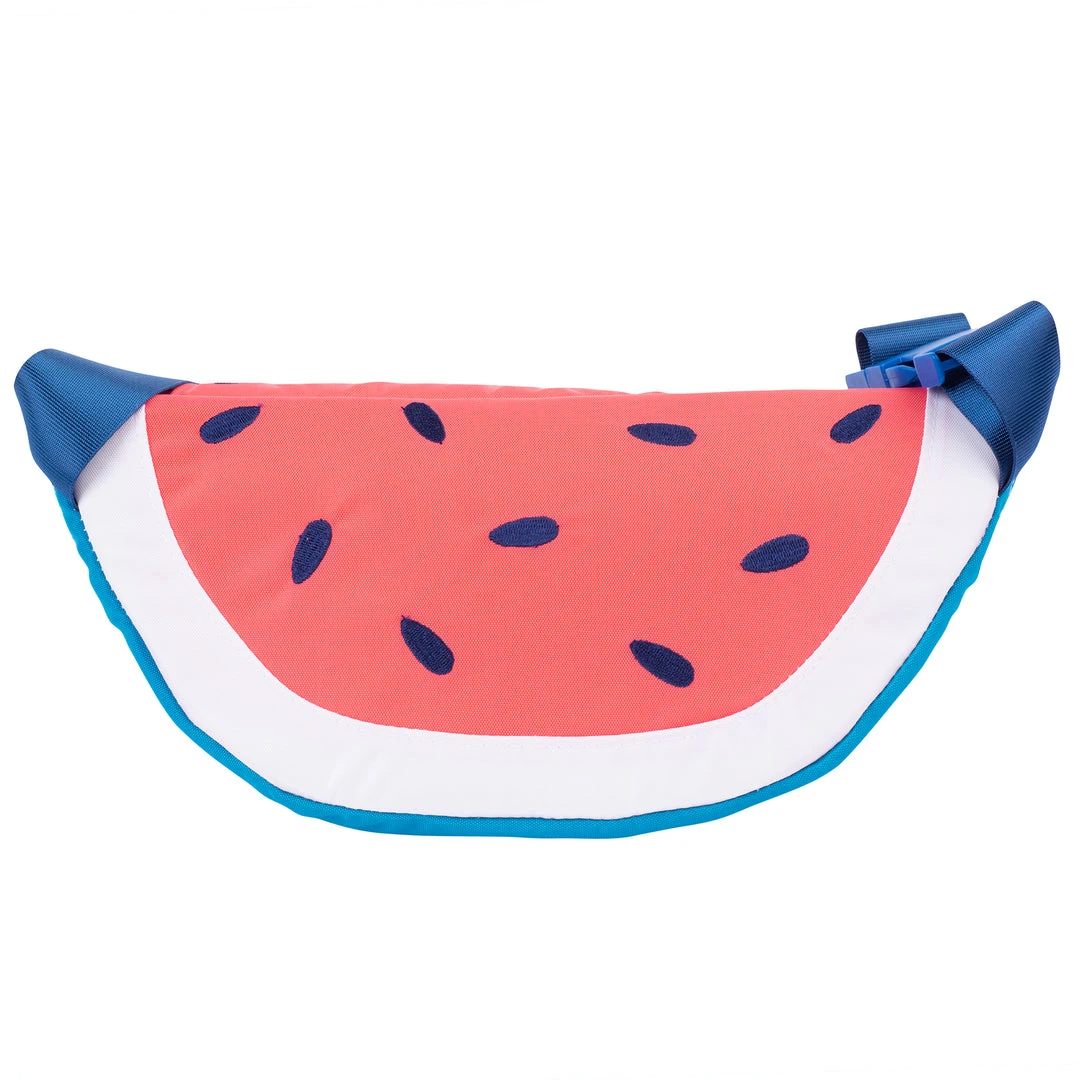 This rad fanny pack also doubles as a cross-body bag! Features a double pull main zipper compartment and lining pocket. Constructed with with water resistant 100% nylon pack cloth. Color block rind detail & embroidered watermelon seeds.