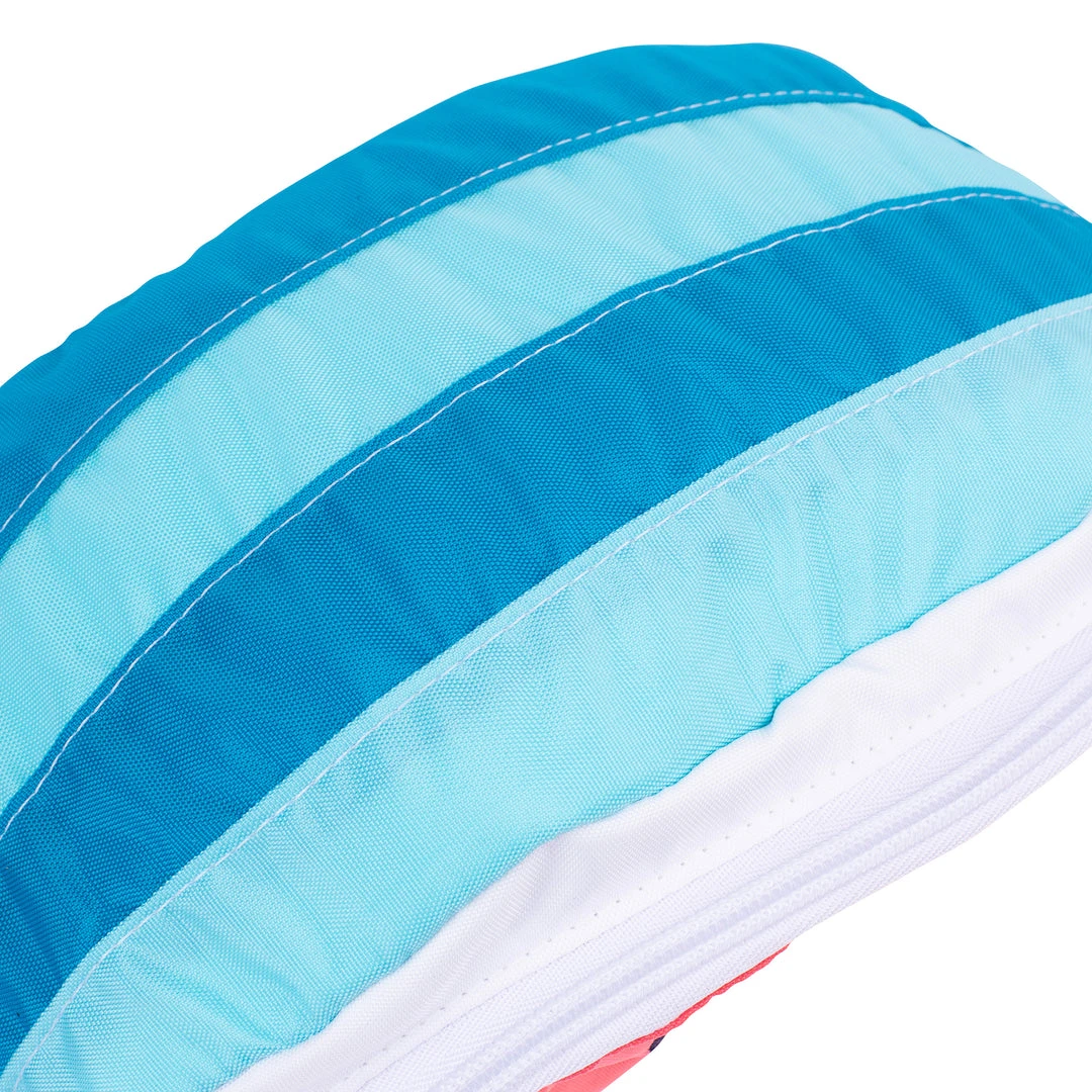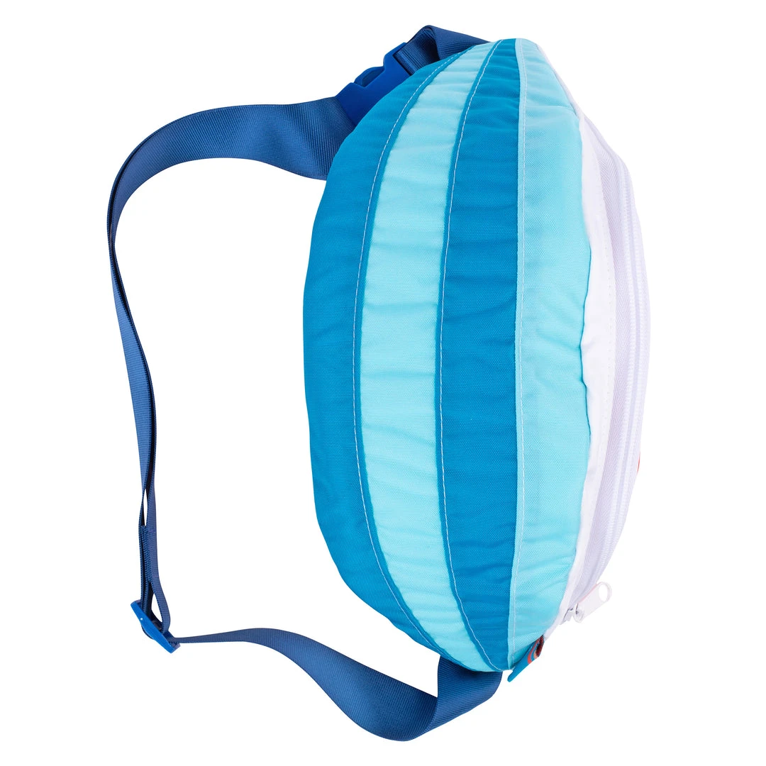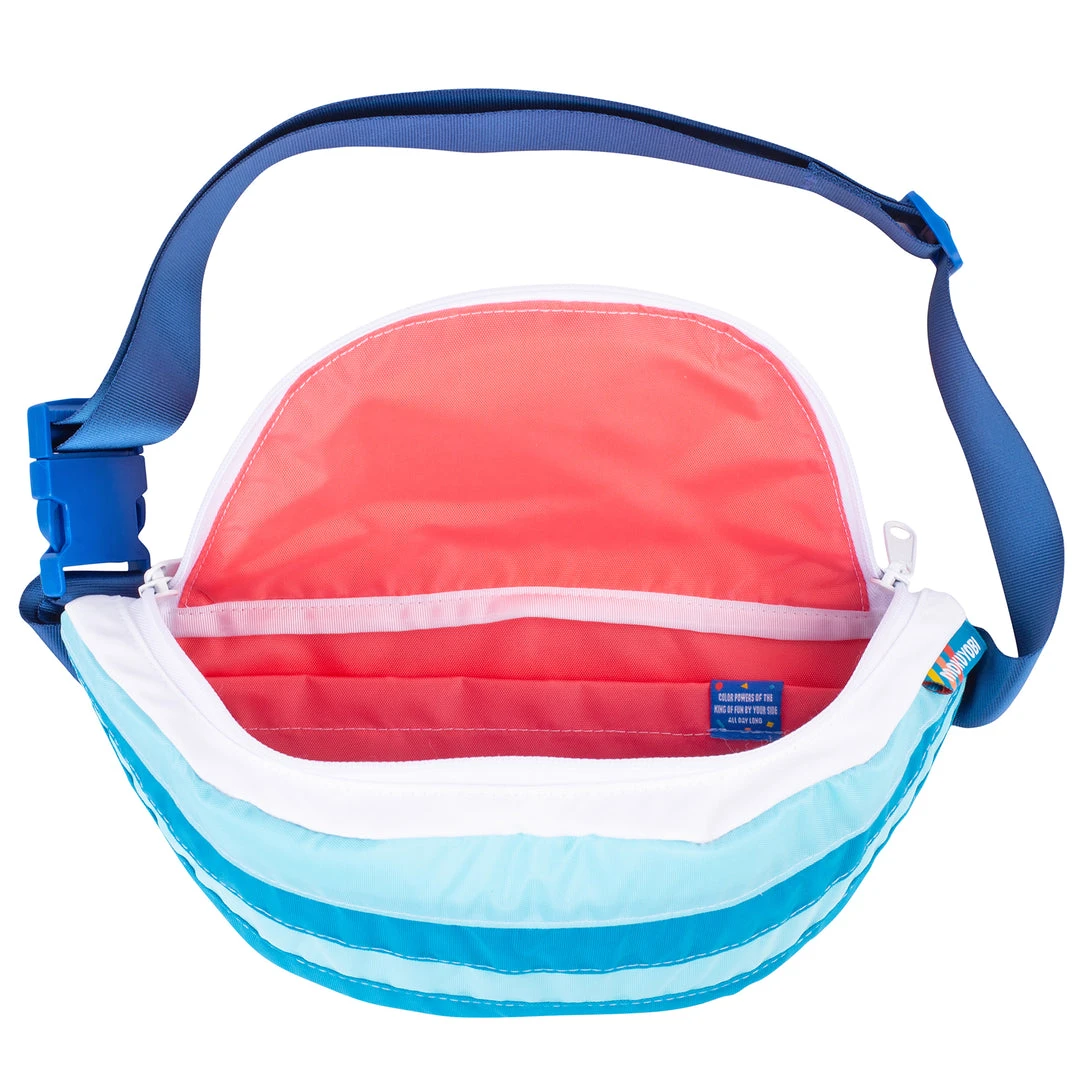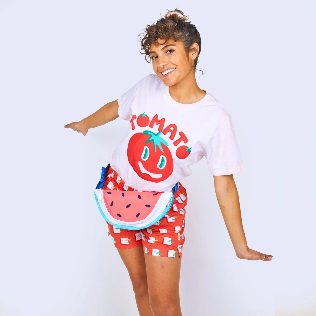 This rad fanny pack also doubles as a cross-body bag! Features a double pull main zipper compartment and lining pocket. Constructed with with water resistant 100% nylon pack cloth. Color block rind detail & embroidered watermelon seeds.
