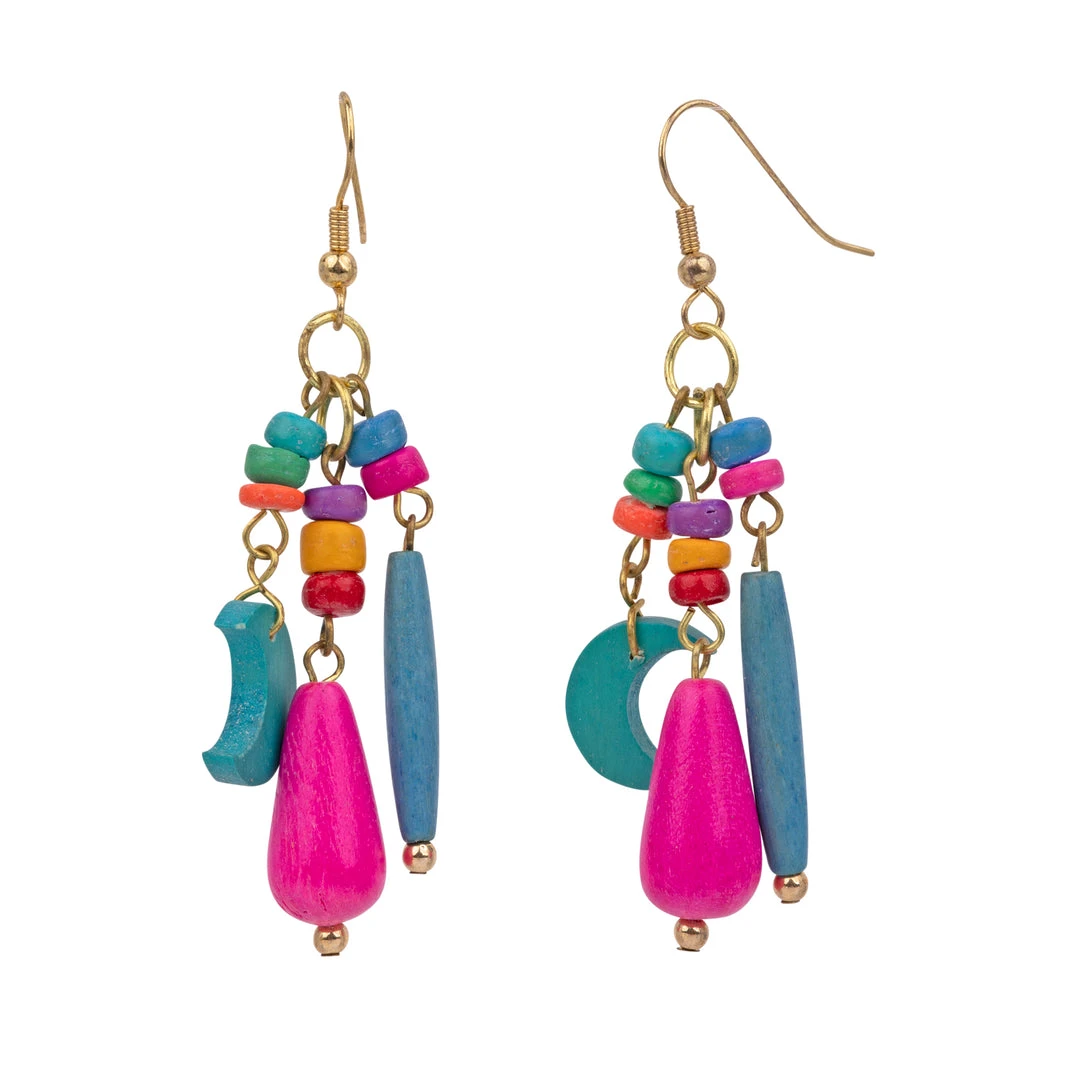 We uncovered hundreds of vintage dead stock earrings from the 1980s. This pair is made of colorfully painted wood with three dangling elements and small beads.