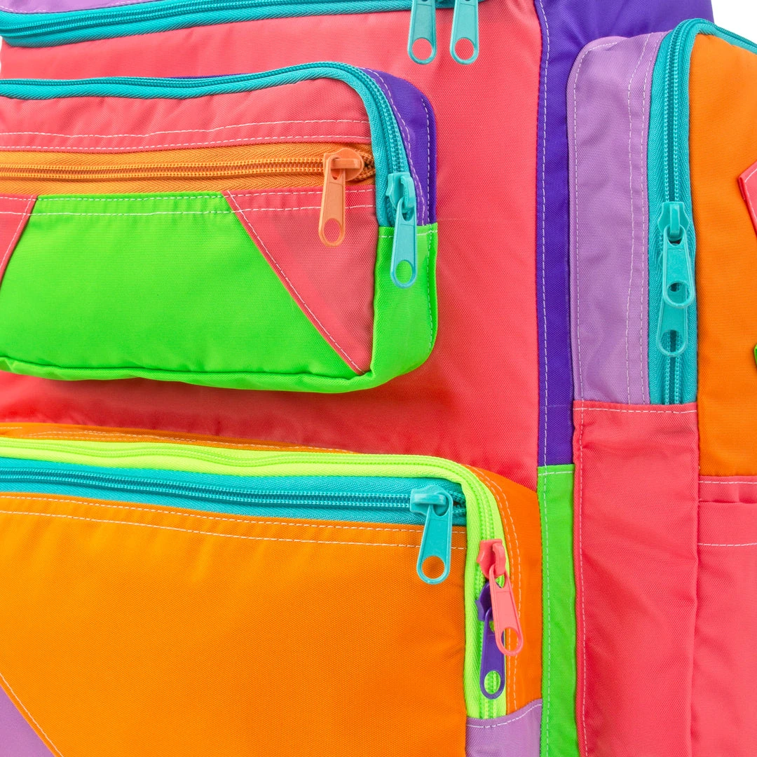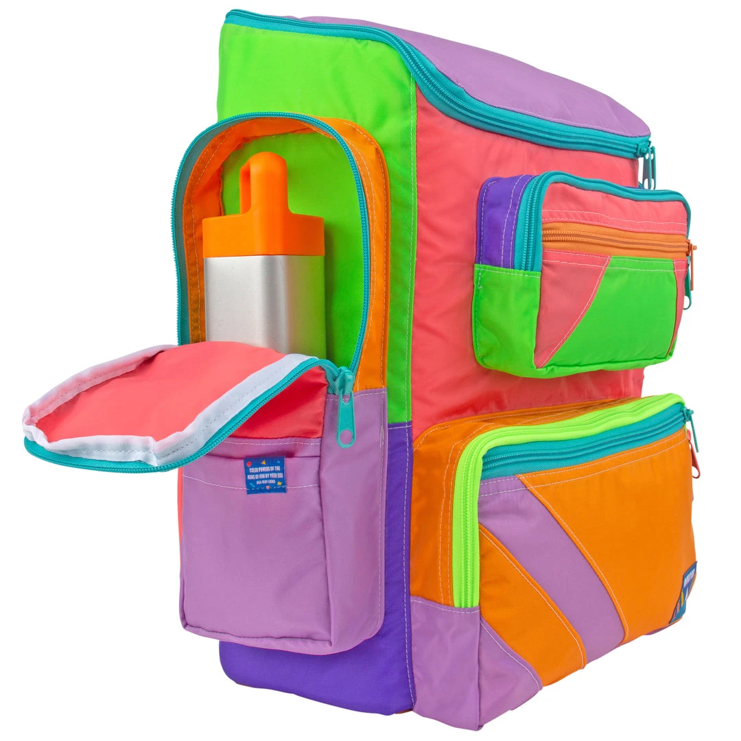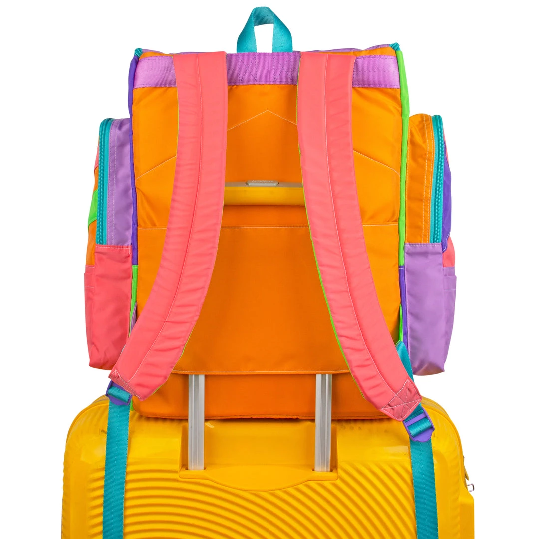 Features 4 separate front zip compartments, two side zip pockets perfect for water bottles or umbrellas and open flat pockets for small items. The padded laptop sleeve in the main compartment fits up to 17″ laptops. Interior zip pocket for stashing valuables. Back suitcase handle anchor for easy travel use, just slide on and go! Foam walls for added structure and insulation.