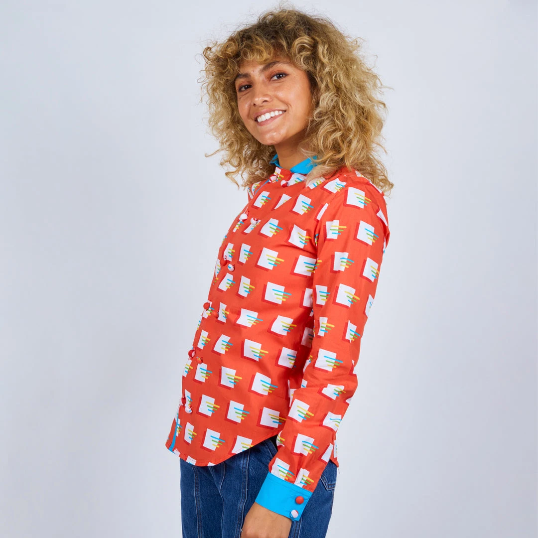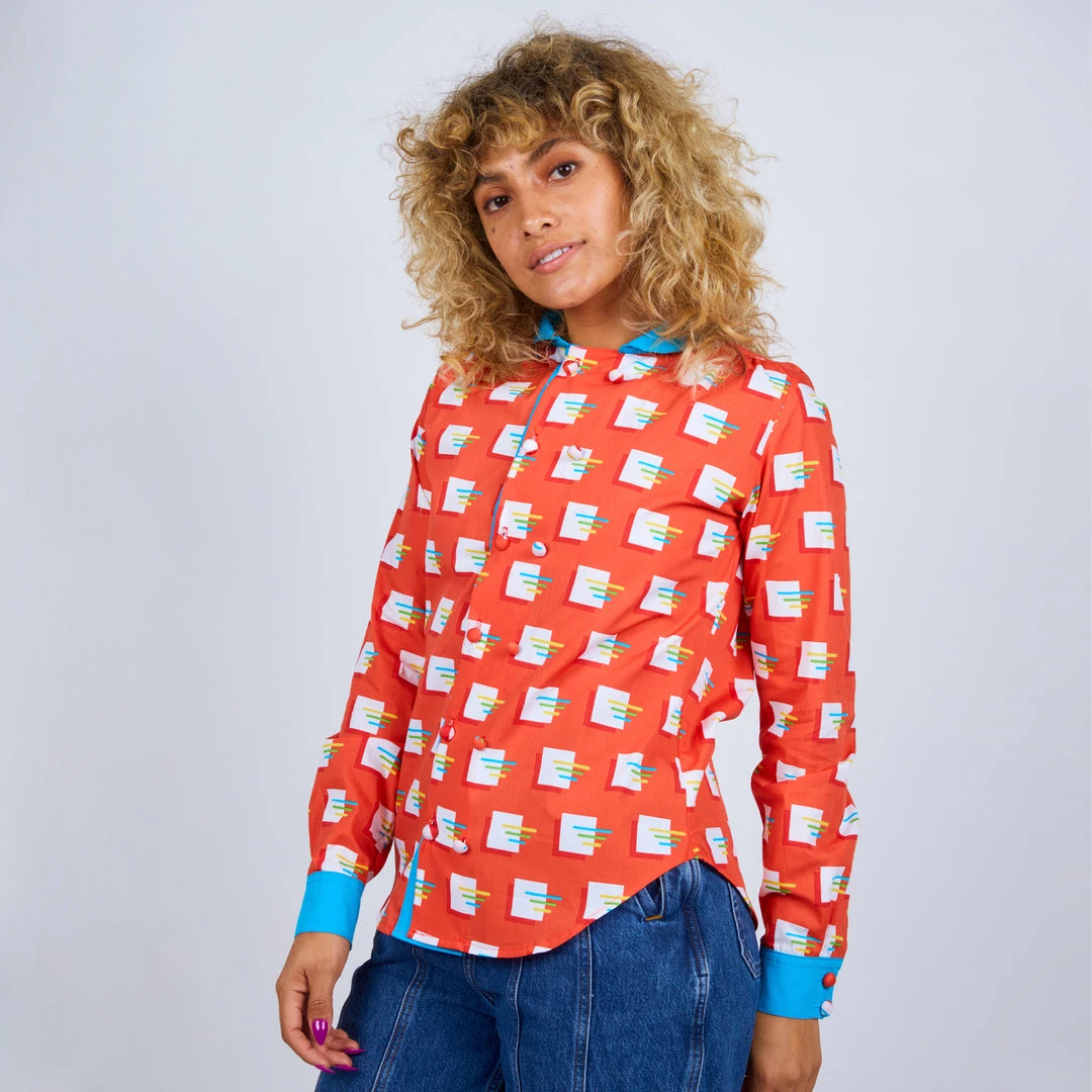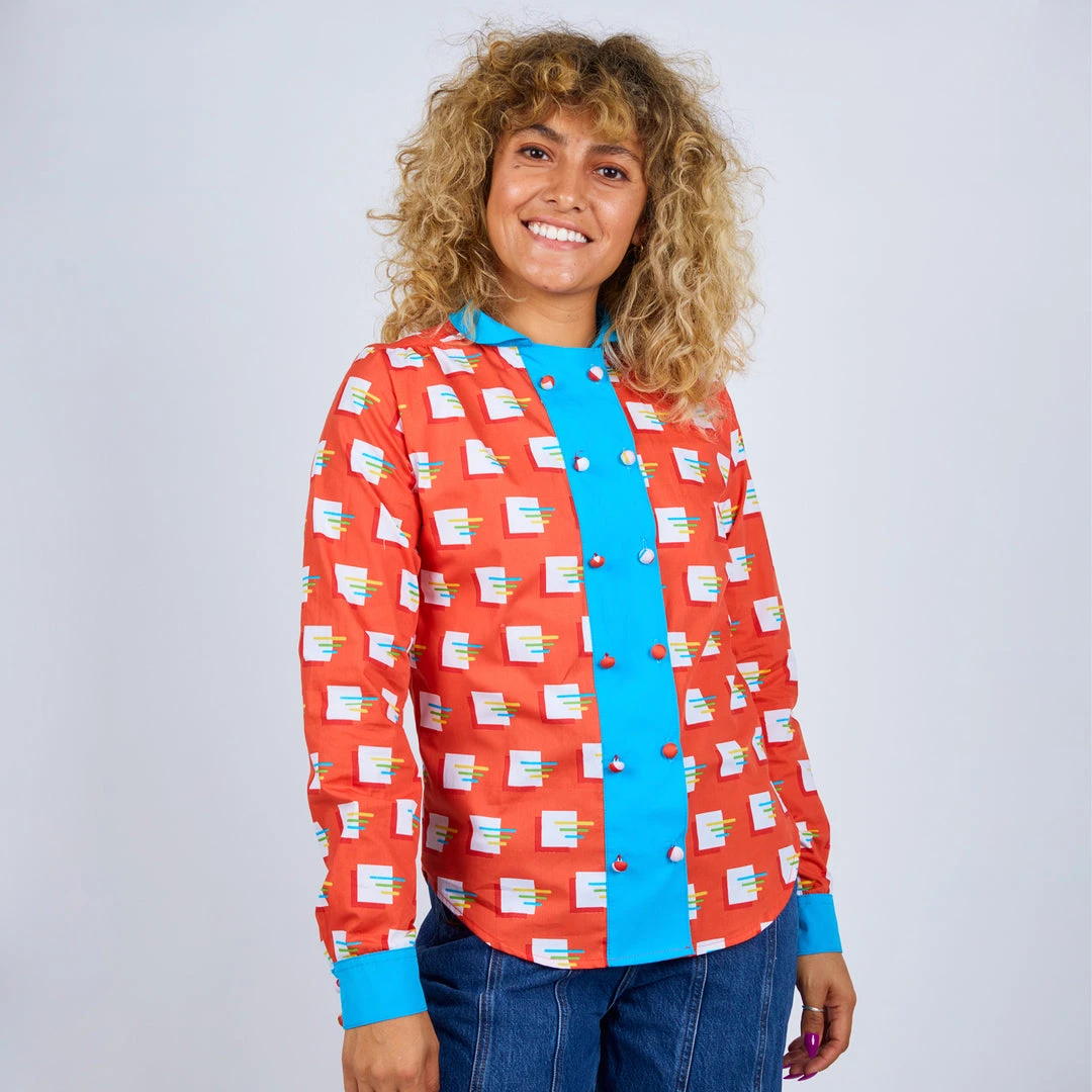 Choose your style with our new long sleeve button up blouse. Featuring a double breasted placket that functions both ways. Pick your look by choosing to contrast your placket or blend with the body color. This style is perfect for both dressy and casual affairs. Close it up with 3D fabric covered contrast buttons! Prepare to turn heads in this rad top!
