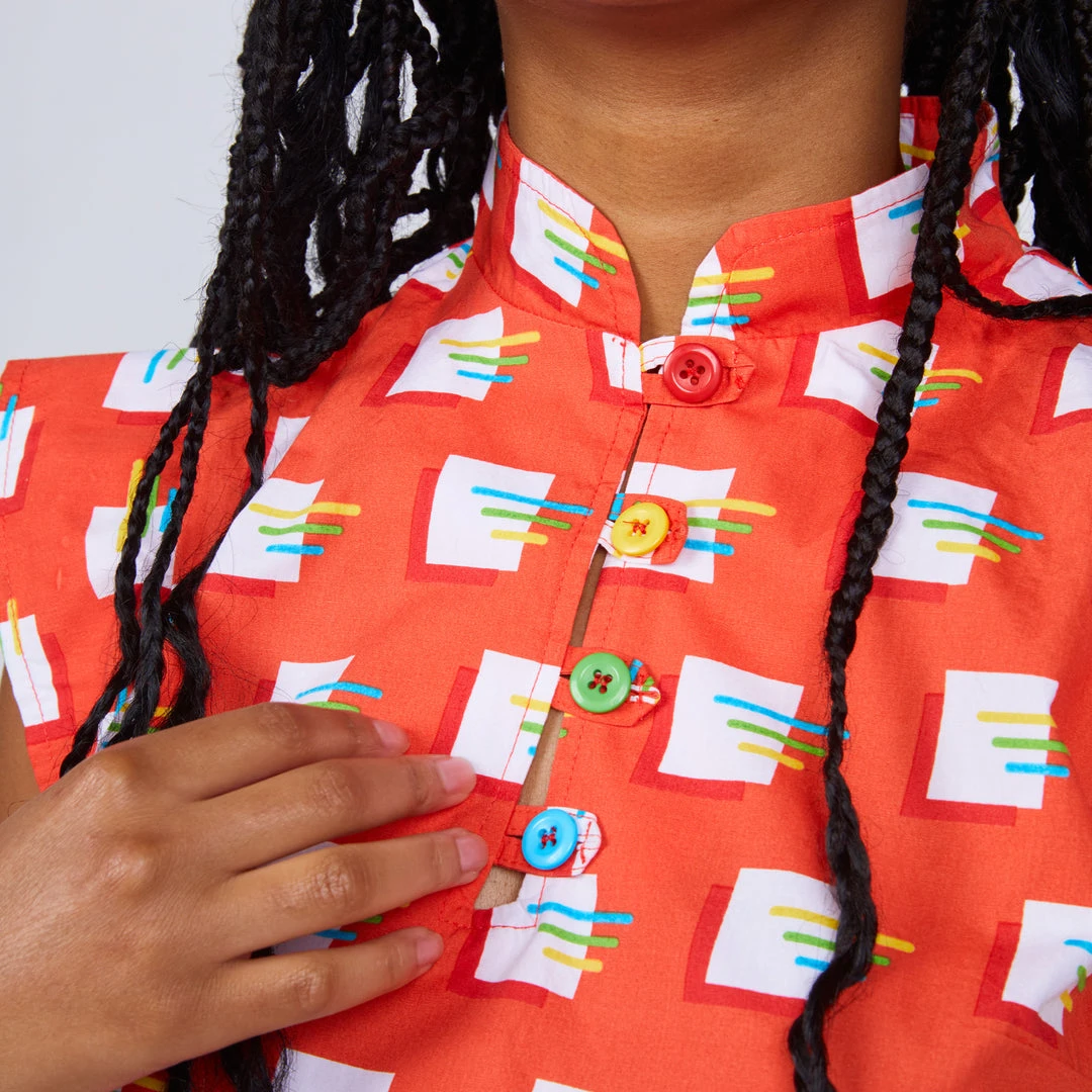 Make some magic happen with this new dressy-casual top! The ornamental sleeves fan out from the shoulders for a fun silhouette. Features a button front closure with four different color buttons that match the allover print design. Wear it open or button it all the way up.
