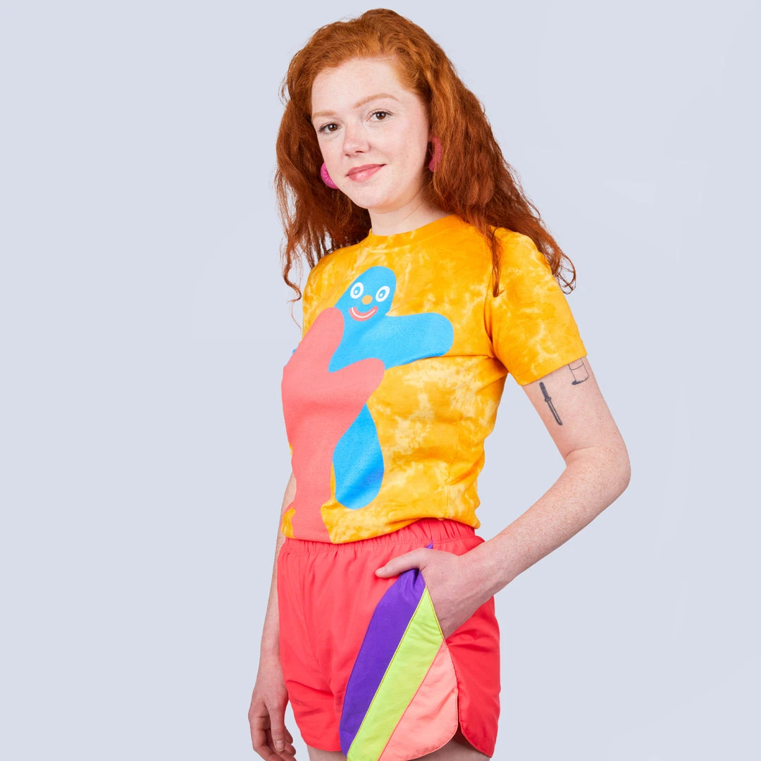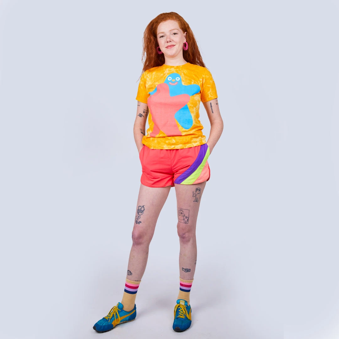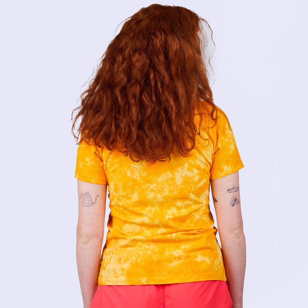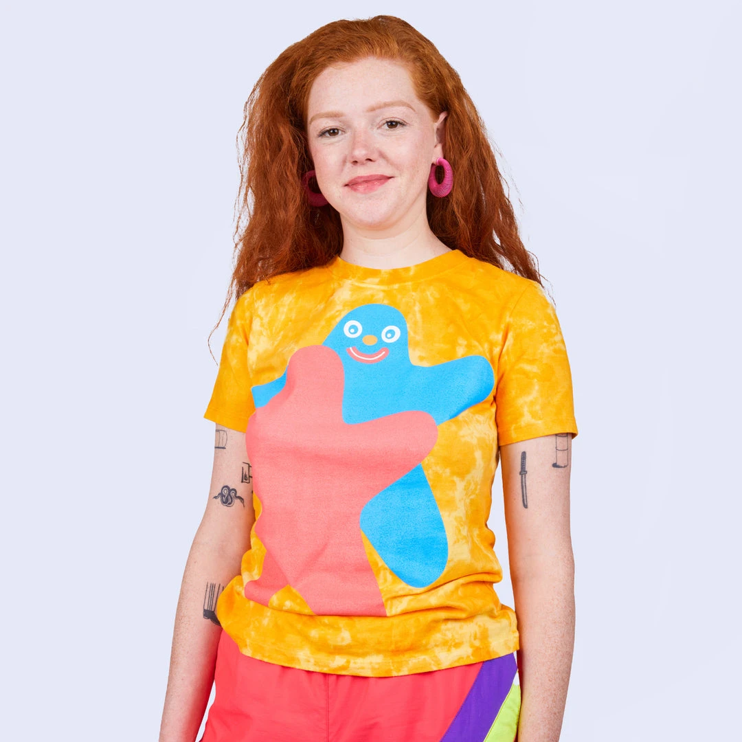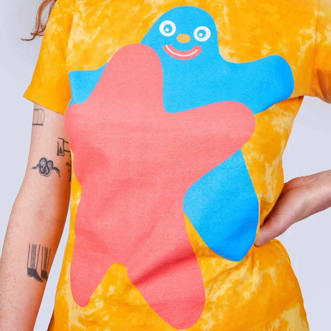Bring it in buddy! This rad heavyweight tee with an orange tie dyed base has us prepared for a big hug!