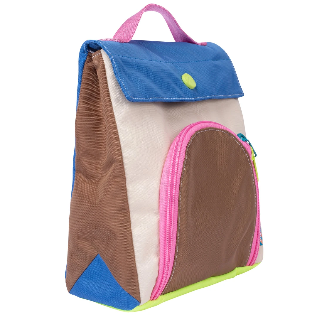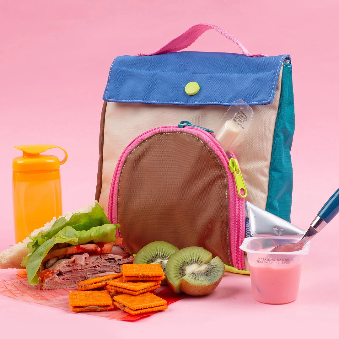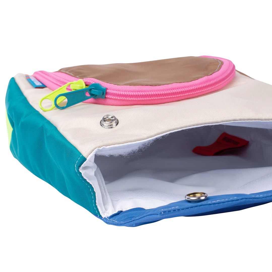 Carry your lunch in style in our rad insulated Lunch Bag! Features an open mouth front double zipper pocket for silverware and any other non refrigerator items. Main compartment has a snap and Velcro closure to keep the cold in. Lined with super slick easy clean lining- just pull out and rinse or wipe down! Top tote handle for easy carrying. Color block triangle side details brings back those old school paper lunch sack vibes. Holds up to 10 pounds of tasty goodness!