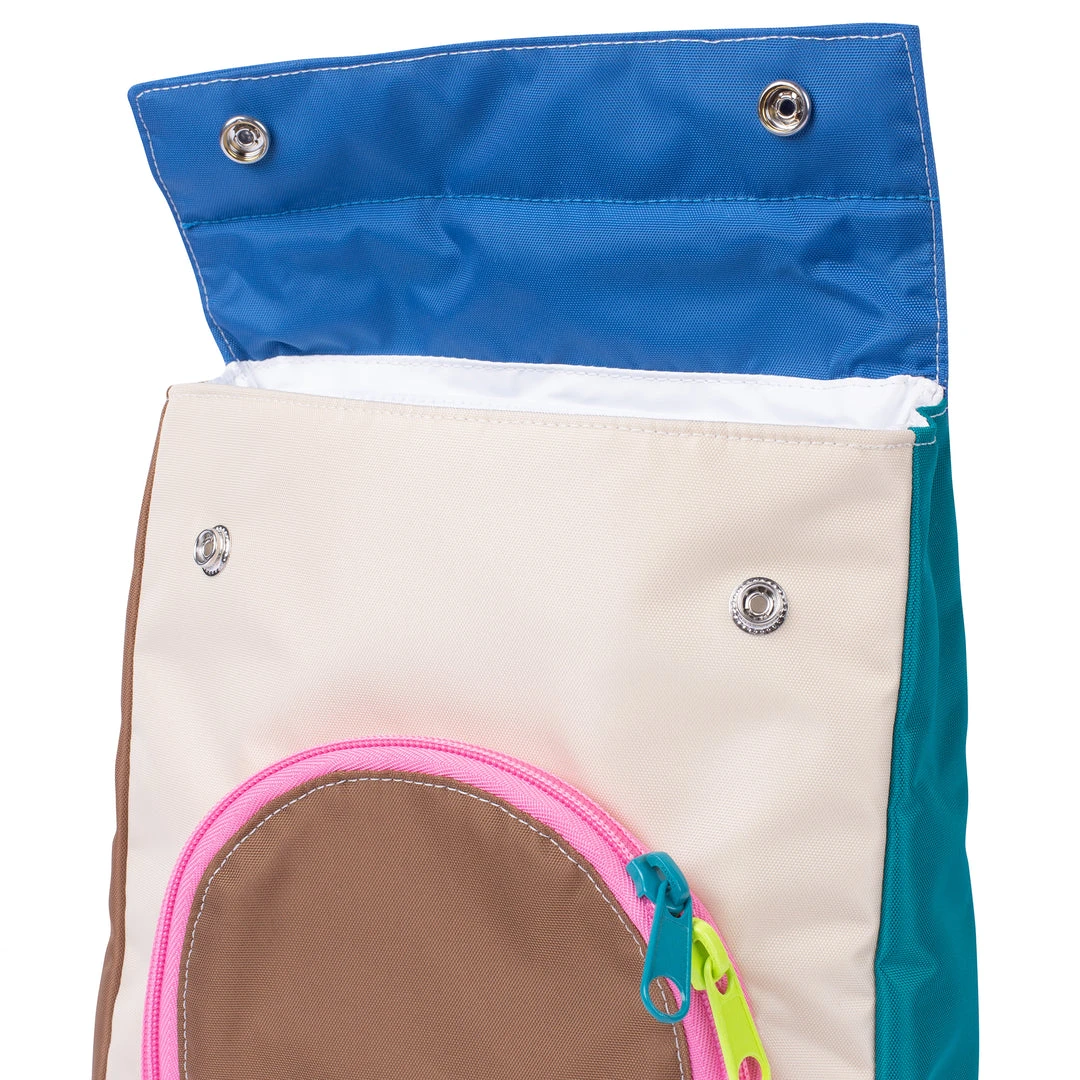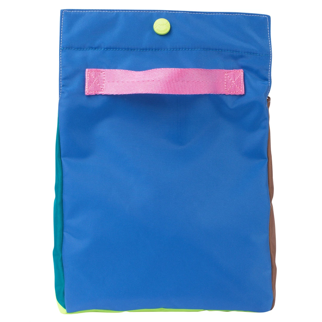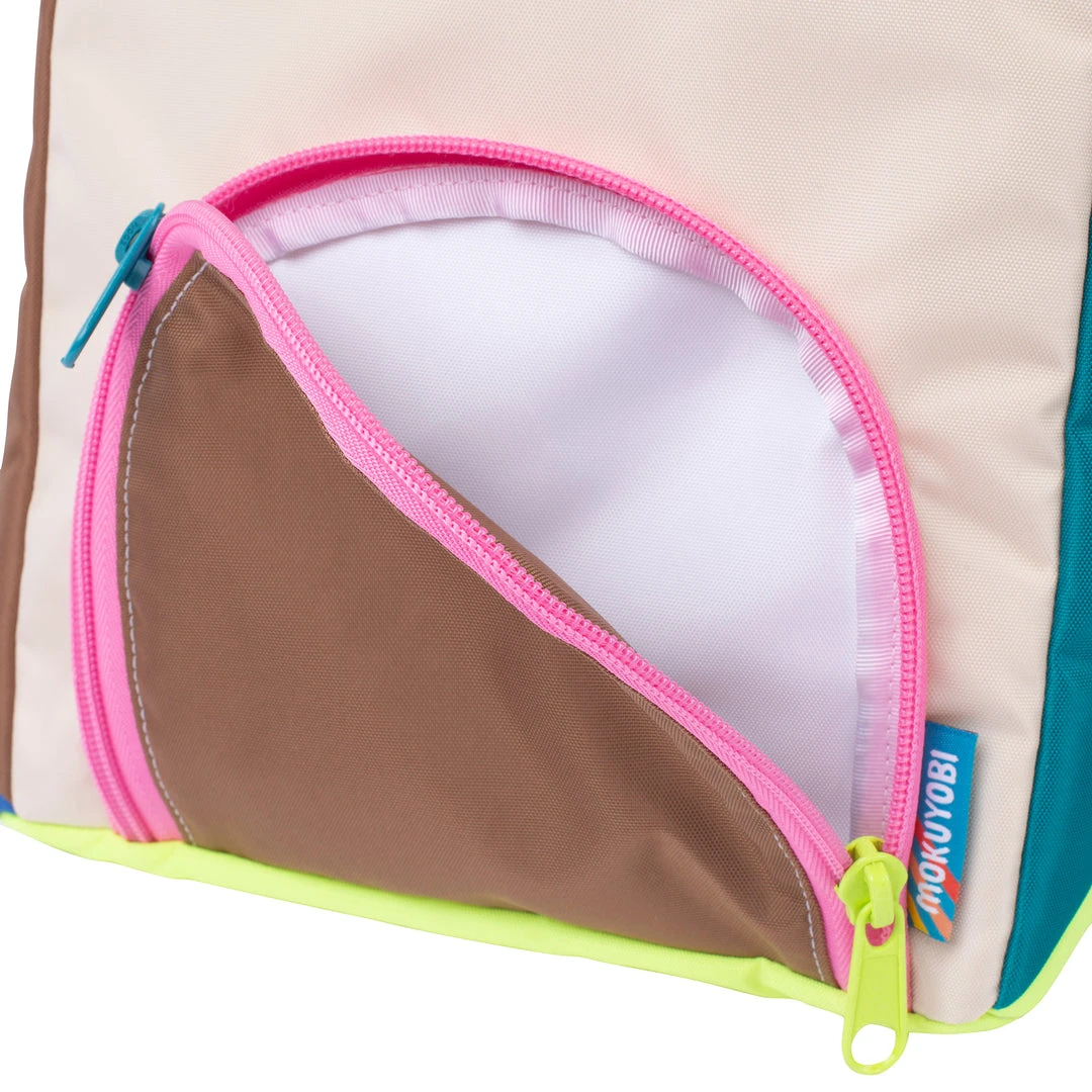Carry your lunch in style in our rad insulated Lunch Bag! Features an open mouth front double zipper pocket for silverware and any other non refrigerator items. Main compartment has a snap and Velcro closure to keep the cold in. Lined with super slick easy clean lining- just pull out and rinse or wipe down! Top tote handle for easy carrying. Color block triangle side details brings back those old school paper lunch sack vibes. Holds up to 10 pounds of tasty goodness!