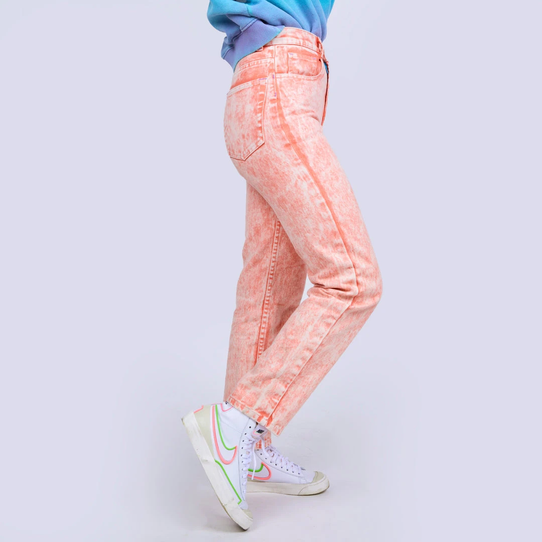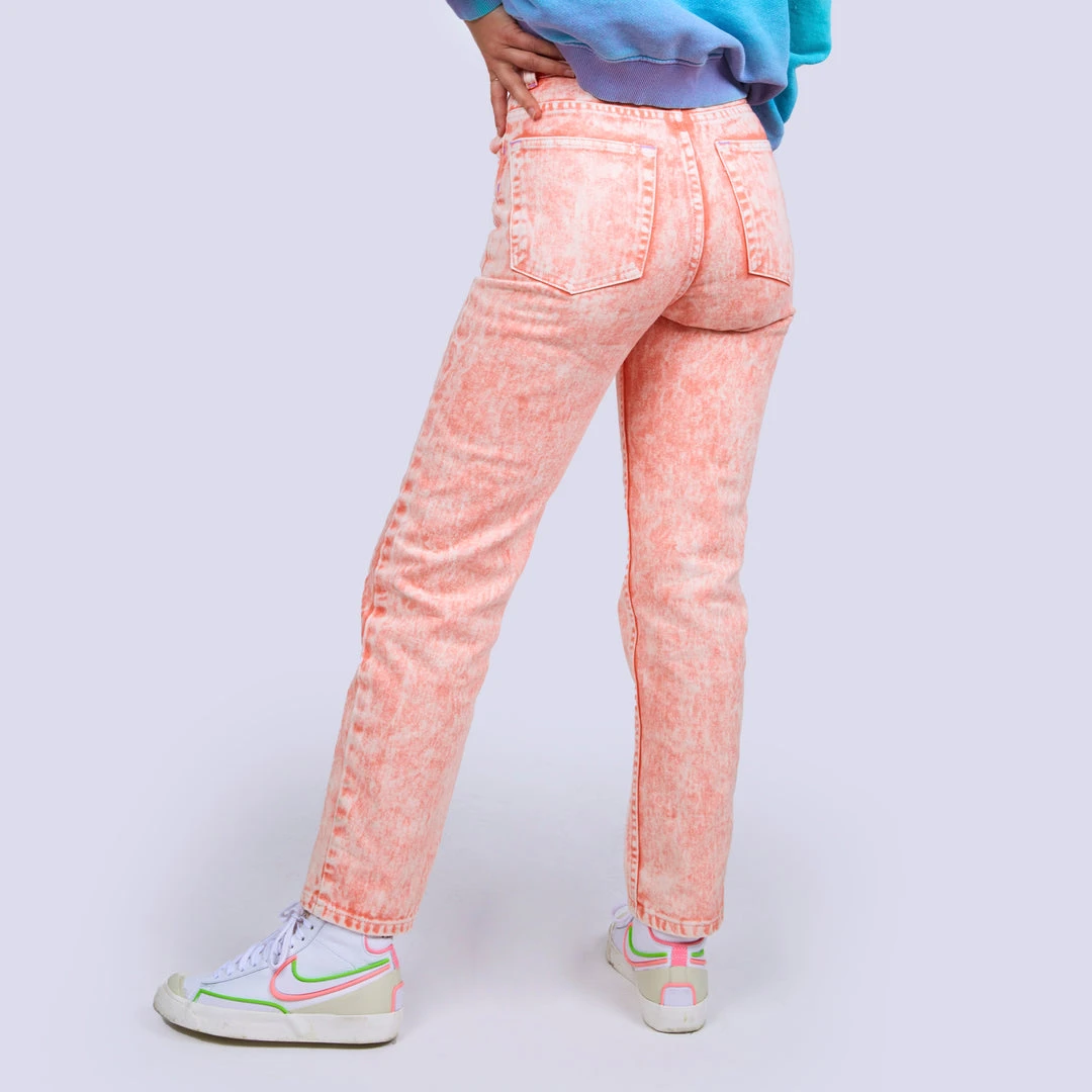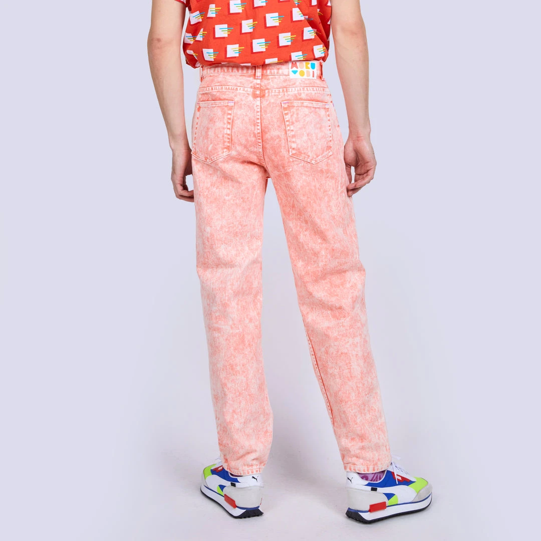 Wow! Look amazing in these rad acid wash jeans in 6 vibrant colors, a modern take on a classic! A flattering unisex silhouette that will be a coveted addition to your wardrobe rotation. Prepare to turn heads in this mid-rise style with a straight tapered leg. Features two deep front pockets and two back patch pockets with a graphic rubber back waistband logo label.