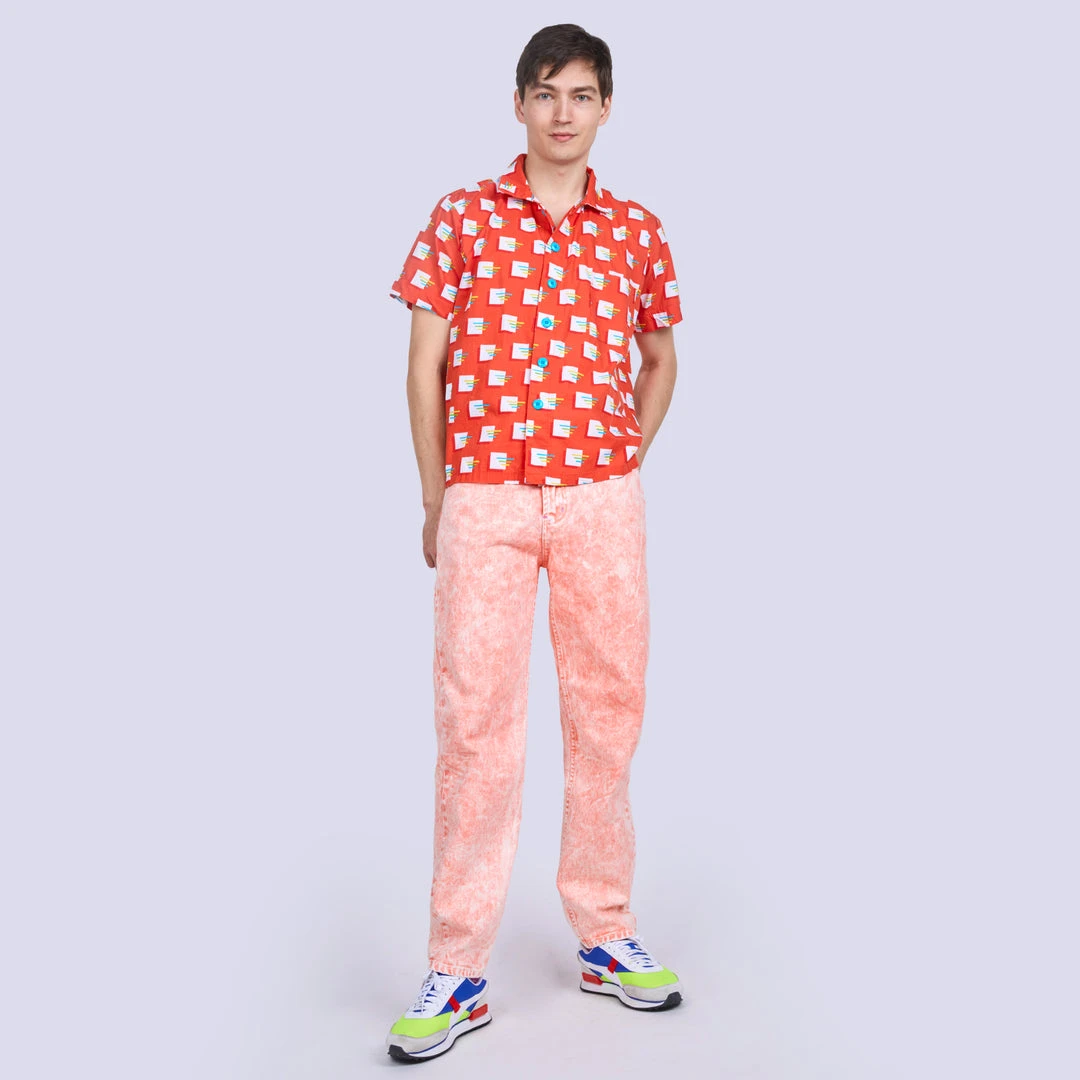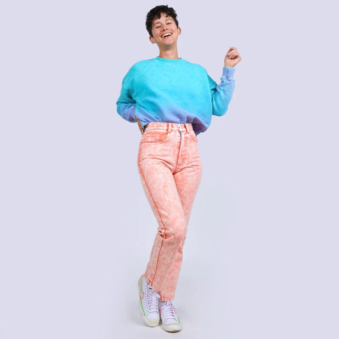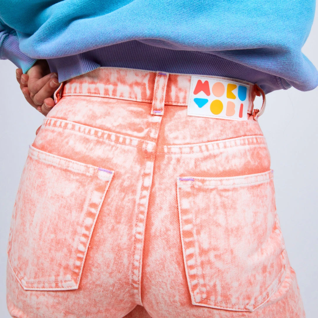 Wow! Look amazing in these rad acid wash jeans in 6 vibrant colors, a modern take on a classic! A flattering unisex silhouette that will be a coveted addition to your wardrobe rotation. Prepare to turn heads in this mid-rise style with a straight tapered leg. Features two deep front pockets and two back patch pockets with a graphic rubber back waistband logo label.