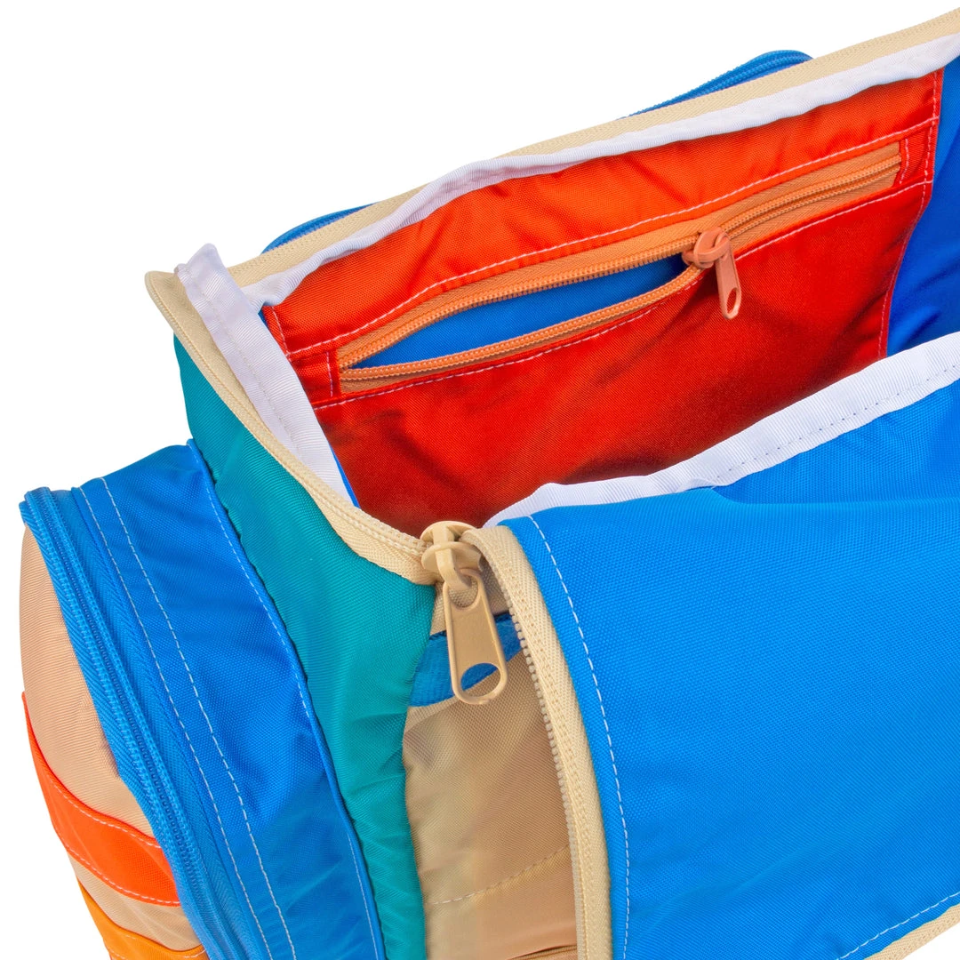 Features 4 separate front zip compartments, two side zip pockets perfect for water bottles or umbrellas and open flat pockets for small items. The padded laptop sleeve in the main compartment fits up to 17″ laptops. Interior zip pocket for stashing valuables. Back suitcase handle anchor for easy travel use, just slide on and go! Foam walls for added structure and insulation.