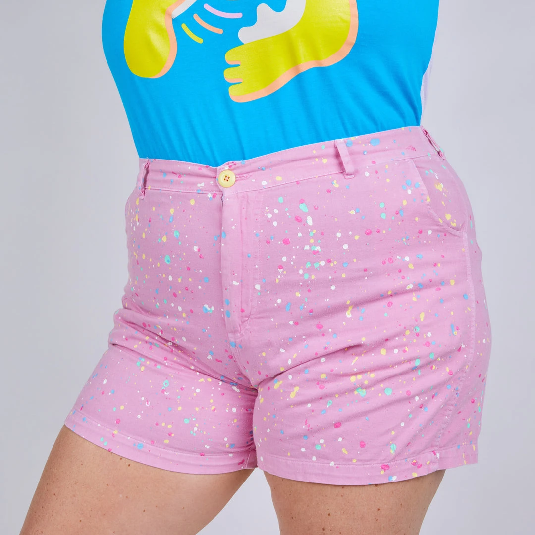 An easy style that’s ready to wear! This high-waisted shorts style is constructed with super soft 100% Cotton Twill with a fun contrast color button closure & super rad allover paint splatter!