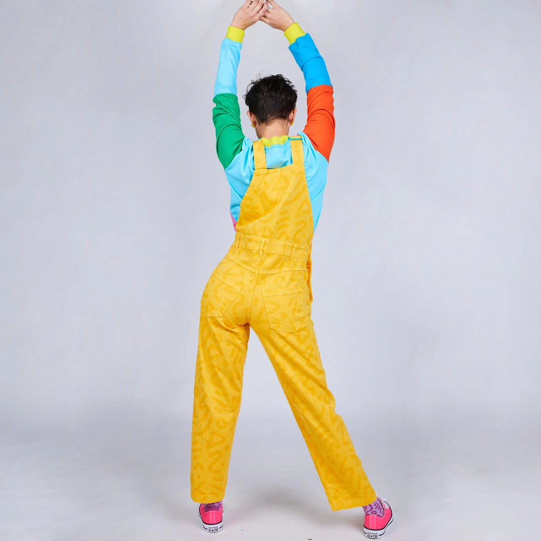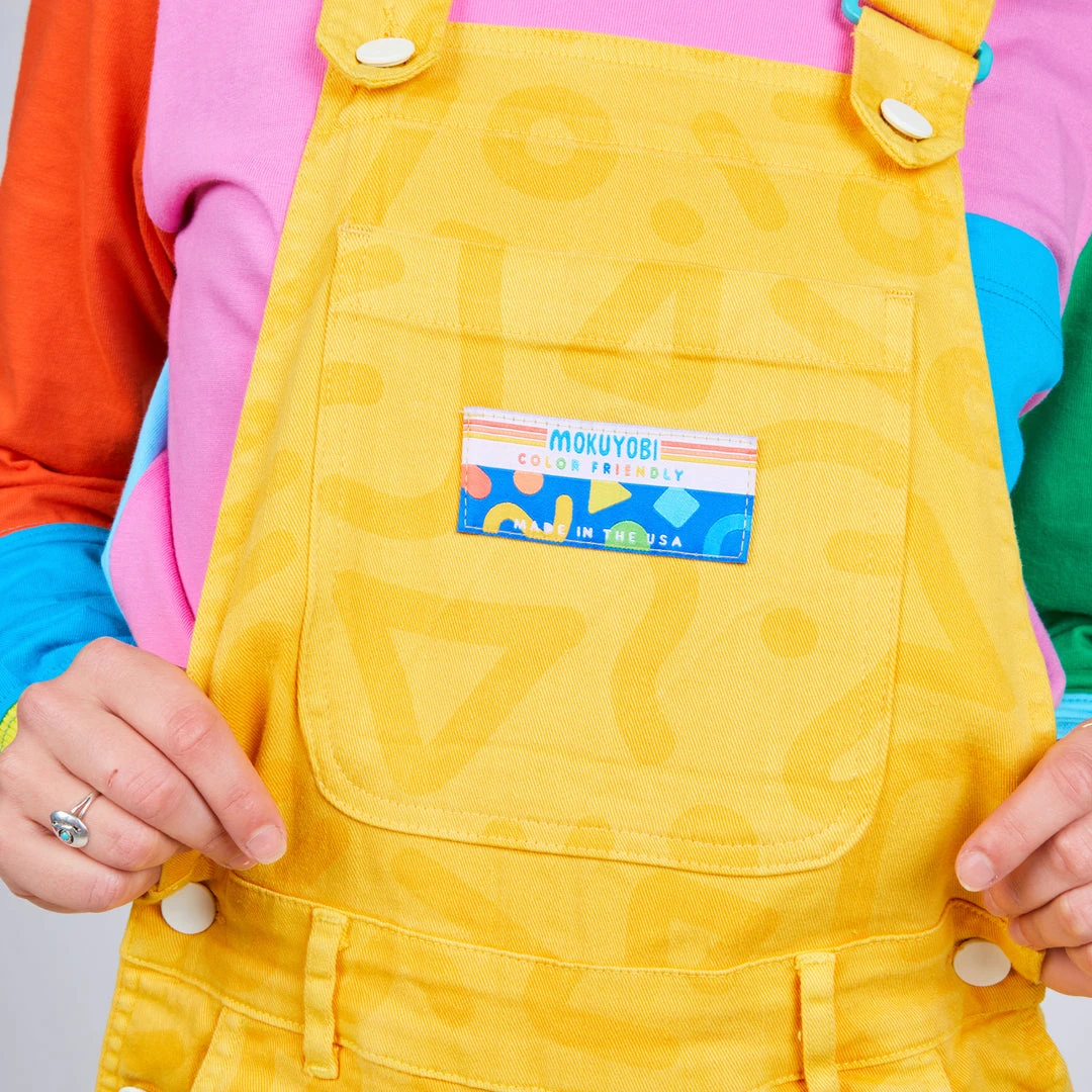 Overalls for all! This totally rad print style with a golden yellow background will have you ready for anything! The stretch fabric make this style super comfortable and easy to move in. Features a large front chest pocket, two front pockets, two back pockets, belt loops, adjustable straps, and secure rubberized tack button closures.